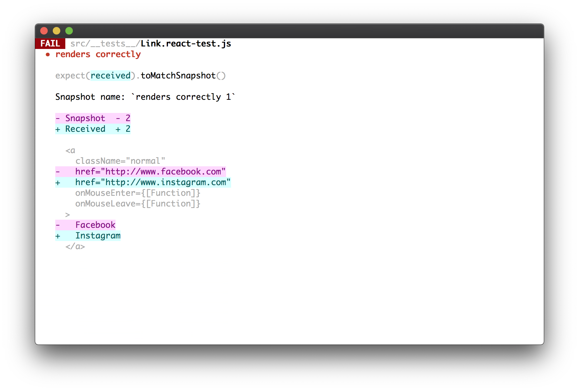 The snapshot artifact should be committed alongside code changes, and reviewed as part of your code review process. The snapshot artifact should be committed alongside code changes, and reviewed as part of your code review process. Jest uses pretty-format to make snapshots human-readable during code review. On subsequent test runs, Jest will compare the rendered output with the previous snapshot. If they match, the test will pass. If they don't match, either the test runner found a bug in your code (in the <Link> component in this case) that should be fixed, or the implementation has changed and the snapshot needs to be updated. On subsequent test runs, Jest will compare the rendered output with the previous snapshot. If they match, the test will pass. If they don't match, either the test runner found a bug in your code (in the <Link> component in this case) that should be fixed, or the implementation has changed and the snapshot needs to be updated.