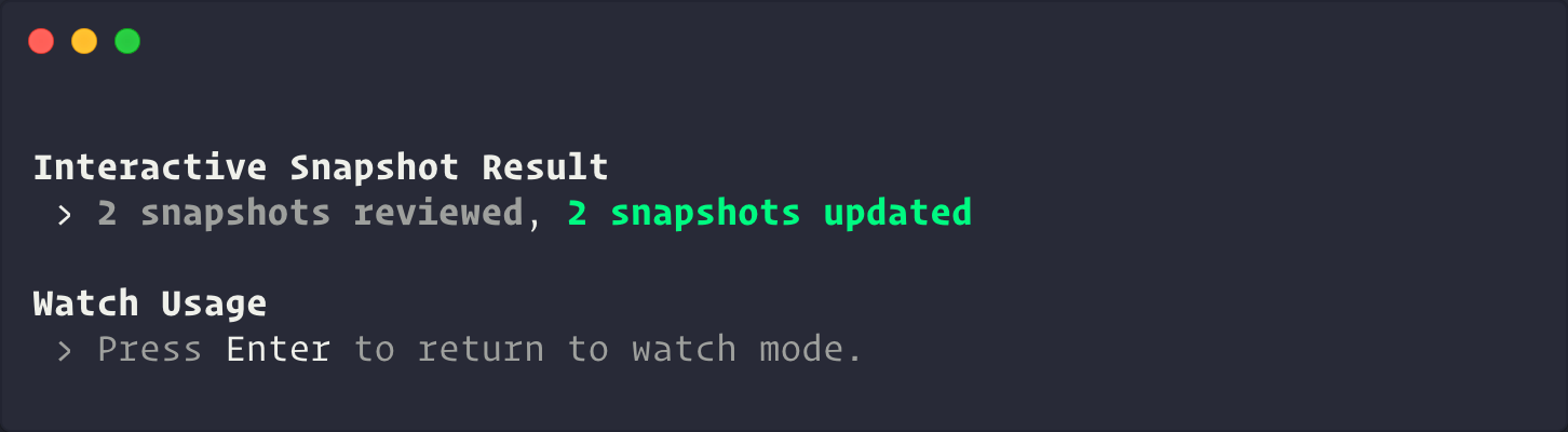Go ahead and accept the changes by running the above command. You may also use the equivalent single-character -u flag to re-generate snapshots if you prefer. This will re-generate snapshot artifacts for all failing snapshot tests. If we had any additional failing snapshot tests due to an unintentional bug, we would need to fix the bug before re-generating snapshots to avoid recording snapshots of the buggy behavior.